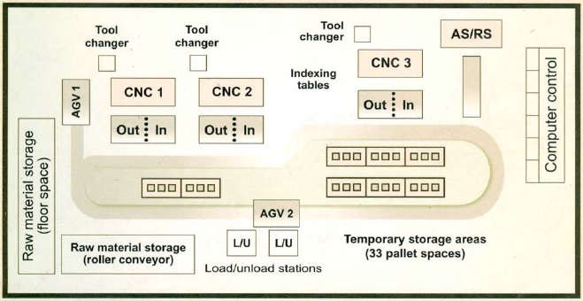 2- سیستم حمل و نقل اتوماتیک (AGV) که قادر است قطعات را بین ماشین های ابزار و دیگر ایستگاه ها حمل و نقل کند. سیستم خودکار انتقال مواد می تواند شامل سیستم های خودکار انبار و بازیابی مواد (ASRS) نیز باشند.
